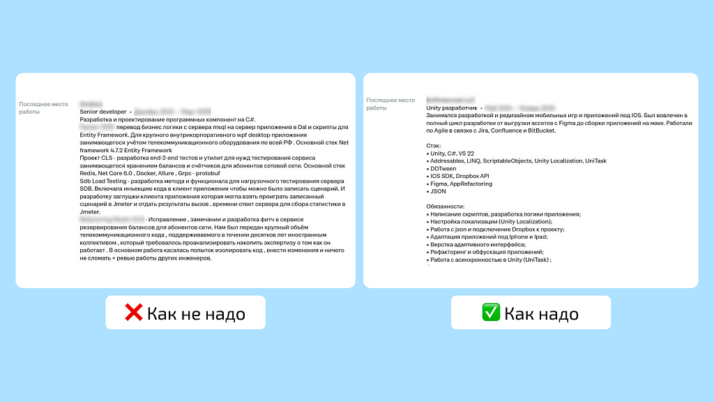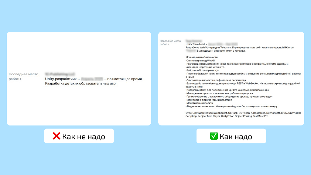 Часто видим в резюме кандидатов расплывчатые формулировки. Например, «разработка казуальной игры». Из такого описания непонятно, что именно делал кандидат, за что отвечал, какая была задача и что получилось в результате.