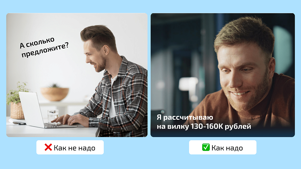 Необязательно называть конкретную сумму, достаточно иметь представление о комфортной вилке. Или назвать две цифры — минимальную и комфортную. А дорого это для компании или в самый раз, решится внутри.