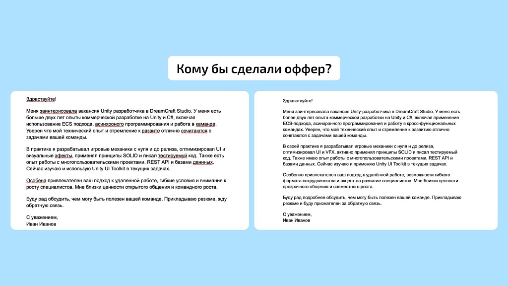 Работать с умом, а не много — девиз последних нескольких лет. Нейросети могут сэкономить кучу времени, но бездумное использование ИИ может подвести. Мы получали несколько одинаковых сопроводительных писем и тестовых заданий. Под «одинаковые» имеем в виду прям буква к букве. Ну и автор был один — нейросеть.