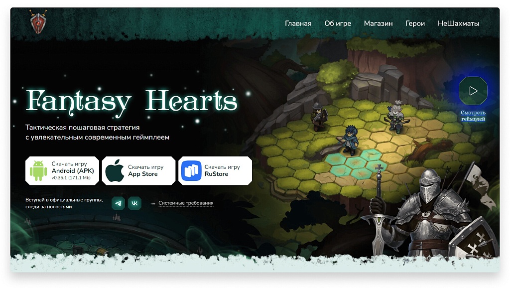 Для примера посмотрите наш сайт по Fantasy Hearts. Там мы рассказываем о каждом герое, локациях и ходе сражения, показываем скрины из игры. Там же можно скачать игру с App Store и RuStore, перейти в соцсети или в магазин, где можно купить игровые предметы.