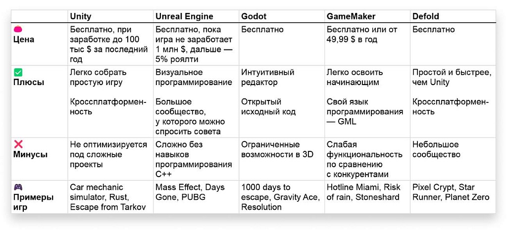 Список не полный, готовых движков гораздо больше. Рекомендуем выбирать тот, что подходит под ваши задачи. На сайтах движков всегда есть база знаний и примеры выпущенных на движке игр — можно посмотреть функционал каждого и понять, устраивает он или нет.