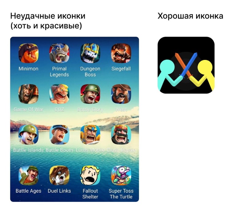 Слева — примеры неудачных логотипов: шаблонные лого визуально сливаются между собой, и даже если игра интересная, логотип не запомнится. Справа — пример удачной иконки: сразу понятна графика персонажей, есть акцент на дуэли.