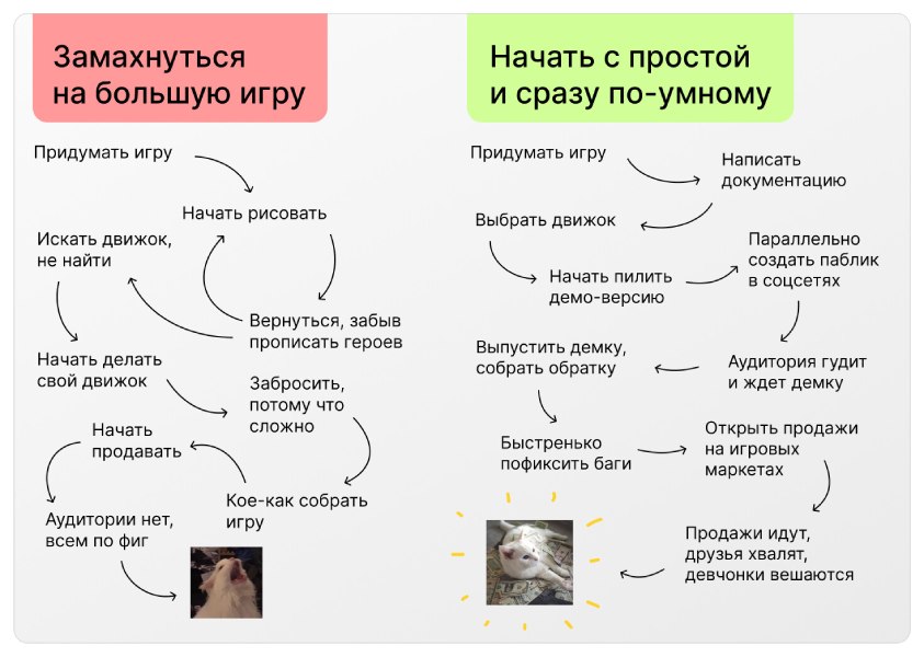Многие начинающие приходят в индустрию не гейм-дизайнерами, а геймерами. И пытаются сразу начать делать то, во что играли сами, не считаясь со сложностью геймдева. На практике, один из важнейших навыков геймдизайнера — это рефлексия. Вы можете не читать никаких книг по геймдизайну и не проходить курсов. Чтобы научиться делать игры, важно выпускать их, наблюдать за опытом игроков и делать выводы. Вот core loop, основной контур вашего развития. Если сразу решаете делать RPG с открытым миром и Souls-like боевкой — вы сделаете плохую игру и поймете это только через несколько лет. Есть ли у вас столько времени? Когда вам хочется сделать большую игру, спросите себя: это ваше желание или вы просто не знаете как сделать маленькую? Потому что придумать 10 классов и для каждого по 20 скиллов может просто упорный геймер, но только хороший гейм-дизайнер может придумать игру, в которую интересно играть палкой и тремя камнями.
