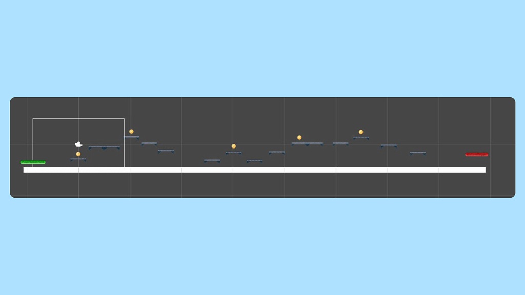 Внешне базовая версия игры выглядела как простой уровень из белых квадратов и кита из заглушки. Внутри мы добавили несколько систем для управления игроком и переключения уровней. Отдельной сценой появился редактор уровней, чтобы геймдизайнеру было удобно наращивать механики и прочие атрибуты.