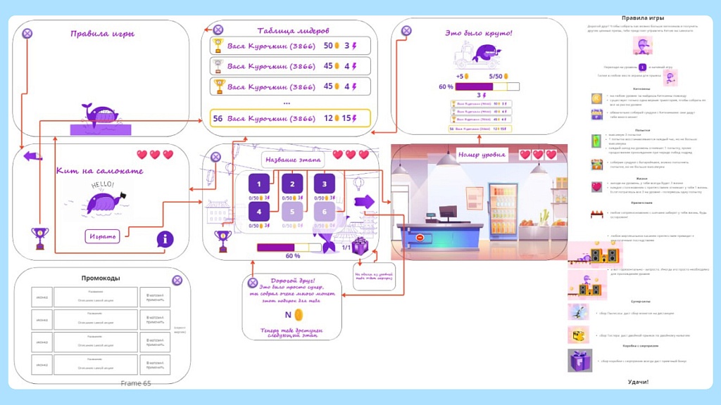 После ряда согласований и консультаций, мы продумали основную механику и цели игрока. Остановились на 30 уровнях, где игроку предстоит выполнять две задачи – перепрыгивать препятствия и собирать монеты. Первое нужно для усложнения прохождения, а второе – для мотивации игроков, ведь за монеты они смогут получать ценные призы!
