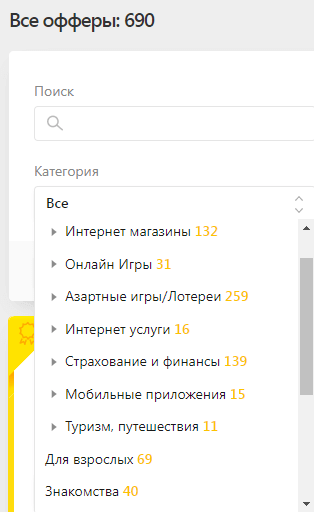 Категорий в Advertise много: от интернет-магазинов до страховок, туризма и даже азартных игр. Нюанс: азартные игры запрещены в РФ, за исключением некоторых регионов, поэтому будьте внимательны – за рекламу запрещенных офферов сайт может быть заблокирован Роскомнадзором.
