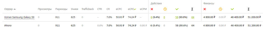 CR — показатель конверсии. Это значение в процентах показывает соотношение кликов к общему количеству лидов. В данном случае у нас 911 кликов, из которых 625 уникальных, и мы суммарно получили 64 лида.