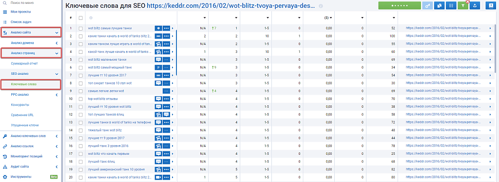 - Дальше в Serpstat смотрим, по каким ключам находят эти страницы, добавляем их в наш список: