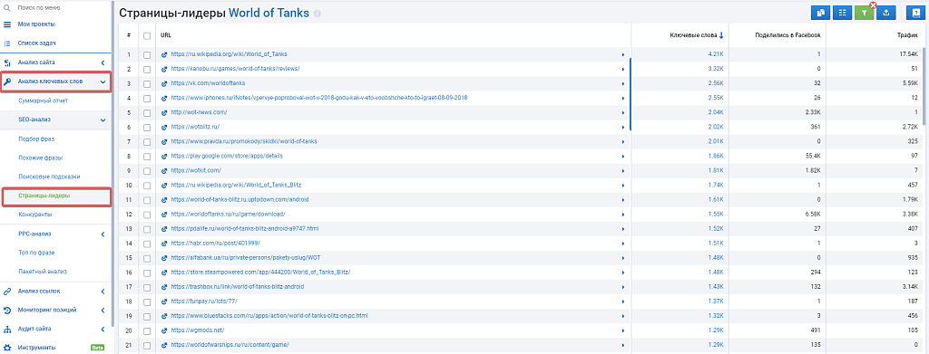 Также можно посмотреть самые популярные страницы по запросу в Serpstat: