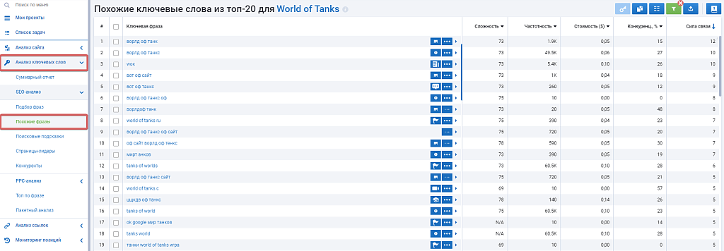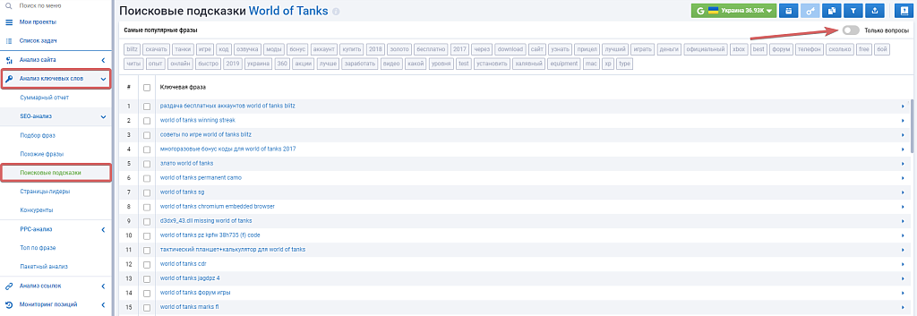 - Собираем все запросы из Wordstat, поисковых подсказок. Или автоматизируем поиск с помощью Serpstat. Тут можно найти и синонимичные фразы: