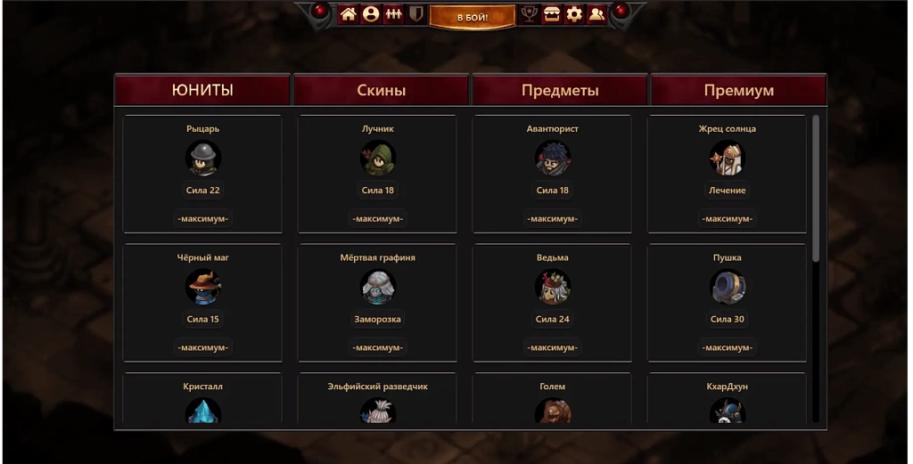 - Любого юнита и предмет можно получить ачивкой в игре, выполнив задание Примеры ачивок: уничтожить Кристалл противника в бою или выиграть бой без Жреца в отряде.